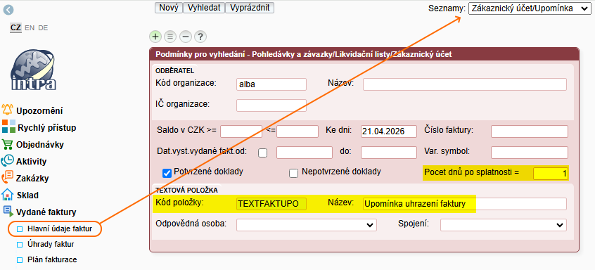 Upomínku zobrazíte v menu Vydané faktury, kde vyberete seznam Zákaznický účet / Upomínka. Zadáte počet dnů po splatnosti (doporučeno 1). Pro text upomínky můžete využít katalogovou položku TEXTFAKTUPO, jejíž obsah se následně zobrazí na sestavě.