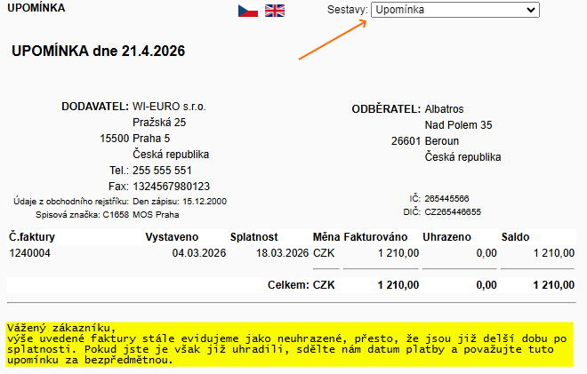 Po vyhledání se zobrazí sestava zákaznického účtu. Tu je potřeba přepnout na zobrazení Upomínka. Ve spodní části sestavy se poté zobrazí text převzatý z katalogové položky.