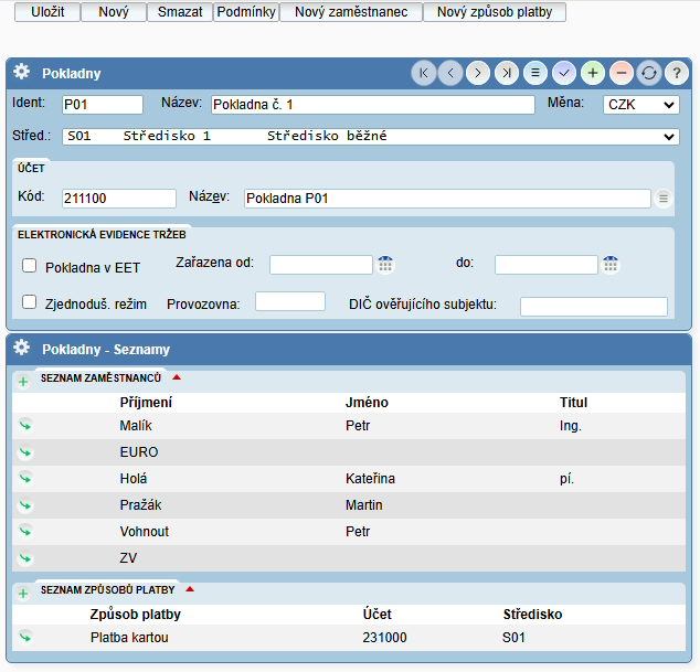 U každé pokladny je jmenný seznam uživatelů, kteří mají do dané pokladny přístup.