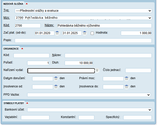 - přednostní srážky – dlužné výživné – hodnota = výše běžného výživného, dluh = částka dluhu v okamžiku evidence srážky