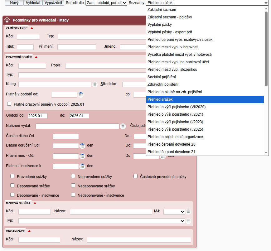 V systému v menu Zaměstnanci / Mzdy / Výsledky výpočtů / volba Seznamy – je připraven speciální seznam “Přehled srážek“, který prezentuje definované a provedené srážky. Výsledek zobrazení tohoto seznamu je ovlivněn nastavením podmínek pro vyhledání, které je možno včetně specifických srážkových polí definovat ve formuláři “Podmínky pro vyhledání“.