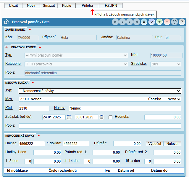 Kliknutím na tlačítko Příloha v mzdovém modulu systému WAK INTRA vygeneruje elektronický formulář dokumentu Oznámení zaměstnavatele o žádosti zaměstnance o dávku.