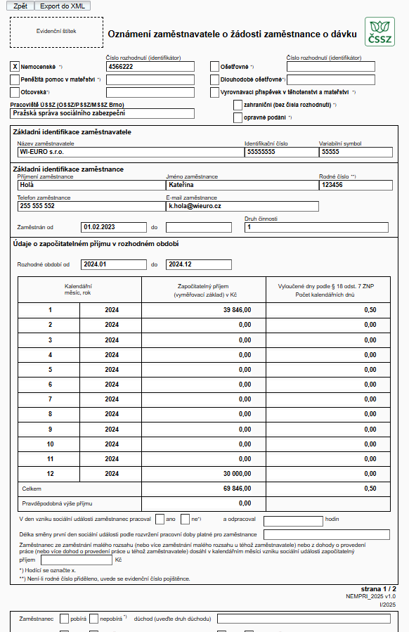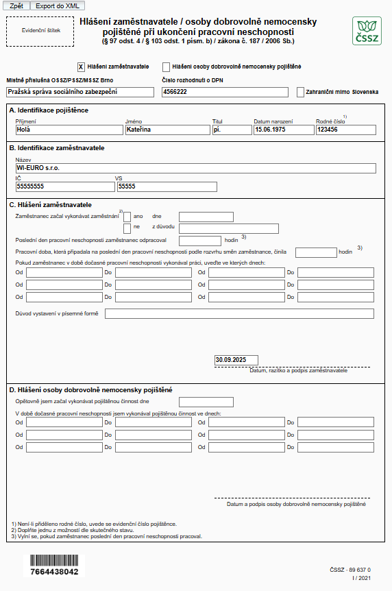 Hlášení zaměstnavatele je předáváno České správě sociálního zabezpečení elektronicky pomocí souboru ve formátu xml, který je možno získat kliknutím na tlačítko Export do XML.