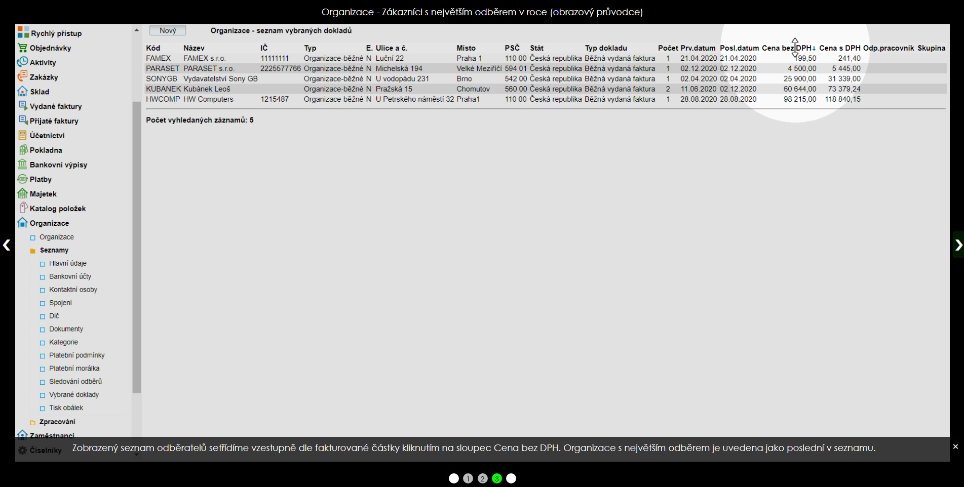Zobrazením přehledu odběratelů dle fakturované částky za sledované období získáte jasný pohled na to, kteří zákazníci mají největší podíl na obratu – a jak se jejich odběr promítá do celkové fakturace. Přehled vychází přímo z evidence faktur vedené v systému WAK INTRA.