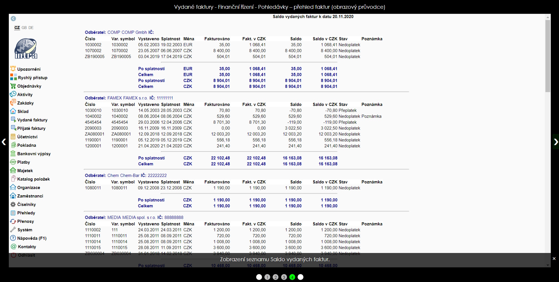 Tento přehled zobrazuje saldo vydaných faktur – včetně přeplatků, nedoplatků, kurzových rozdílů a splatností. Pomáhá sledovat finanční tok, kontrolovat stav úhrad a vyhodnocovat rizika spojená s opožděnými platbami.