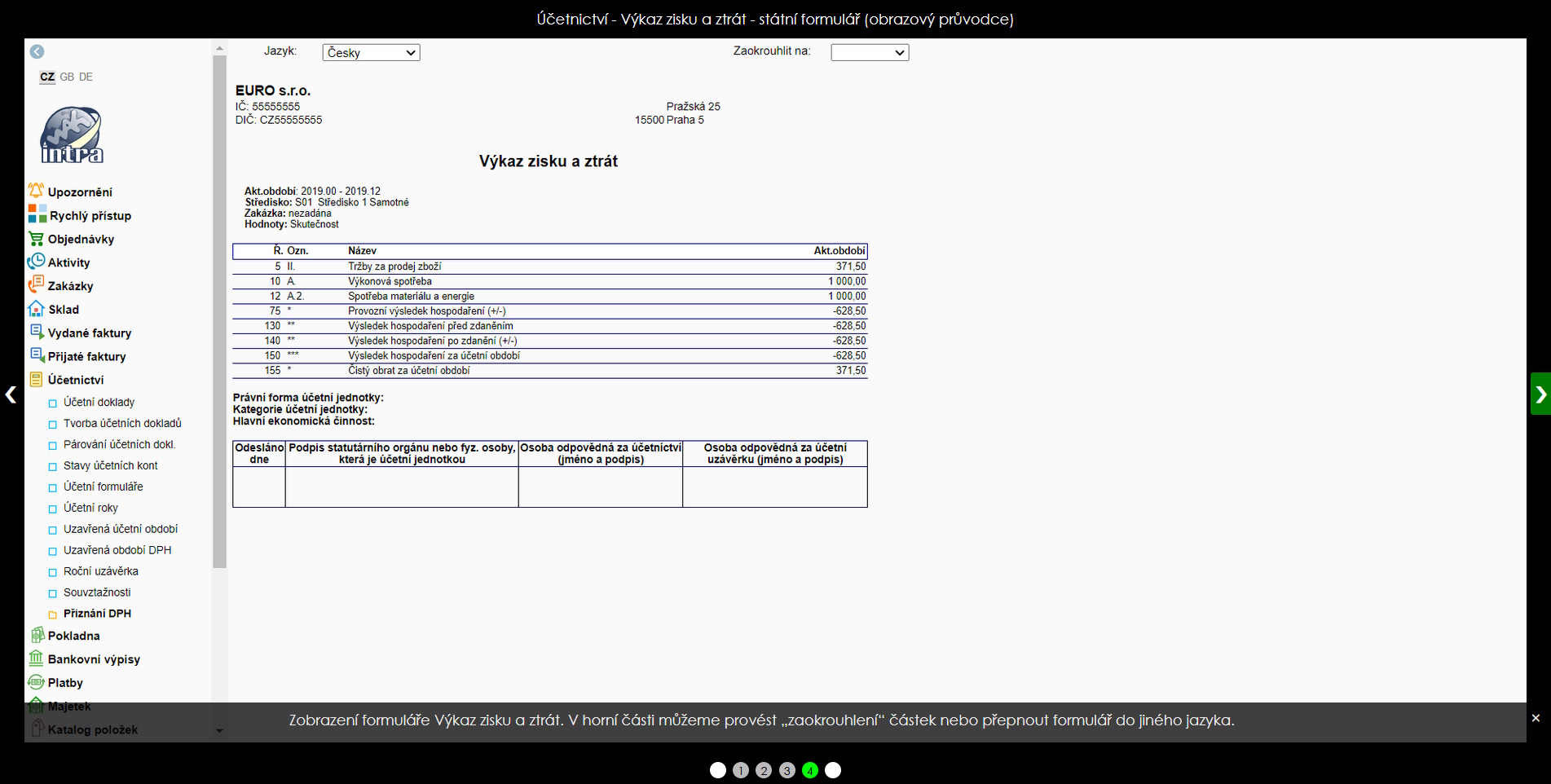 - Zobrazí se státní formulář výkazu zisku a ztrát. V horní části můžete provést zaokrouhlení částek nebo přepnout jazyk.