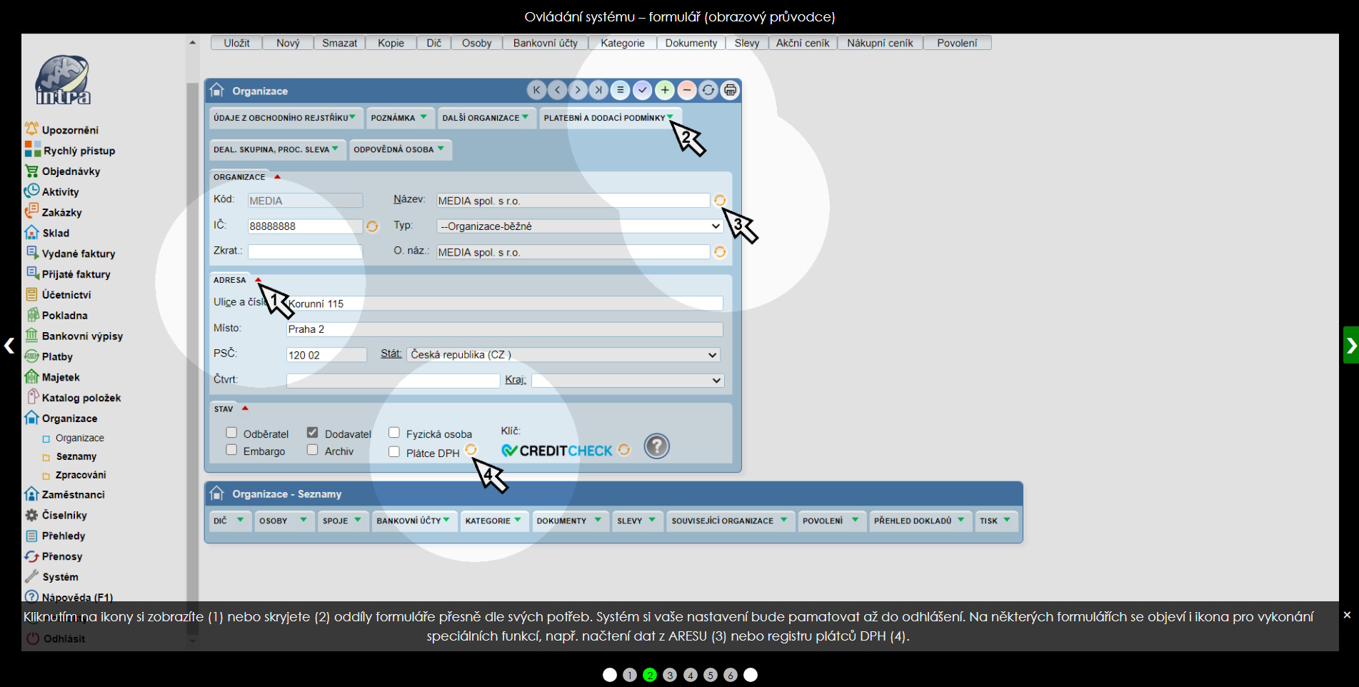 - Prokliky do dalších částí systému – např. do katalogu organizací nebo číselníku středisek.