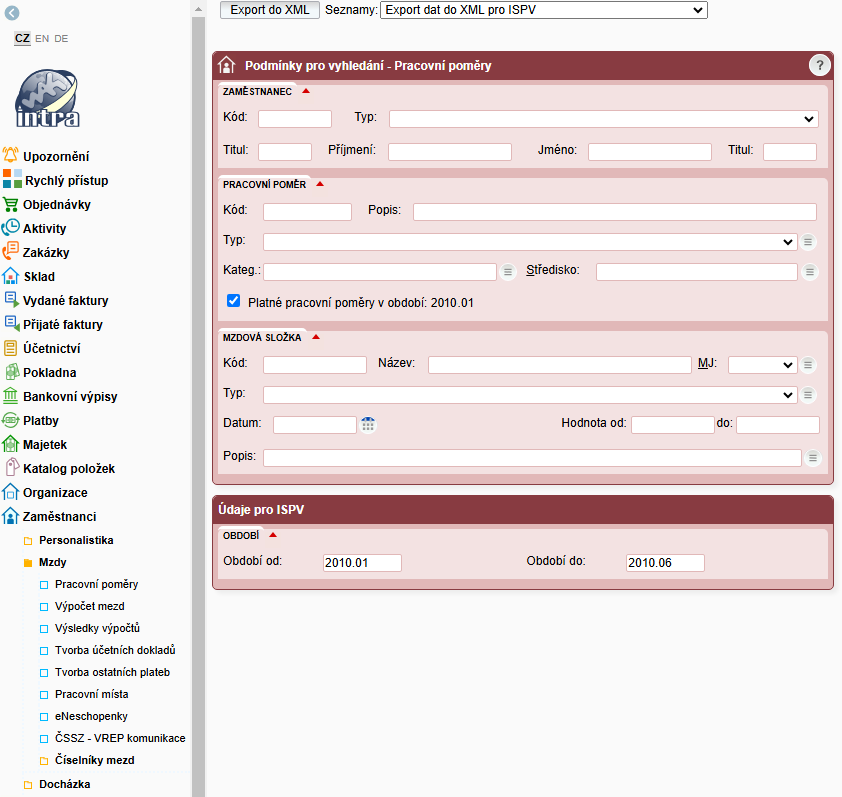 - Menu Zaměstnanci → Mzdy → Pracovní poměry → Export dat do XML pro ISPV