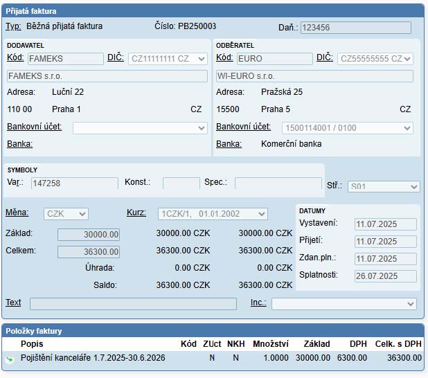 Účtování nákladů příštích období - formulář Přijatá faktura
