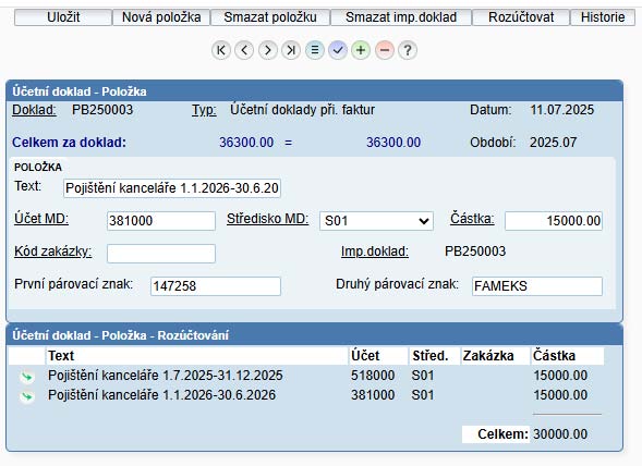 Účtování nákladů příštích období - Účetní doklad - Položka - Rozúčtování - nový účet a částka z celkové částky rozúčtovávané položky