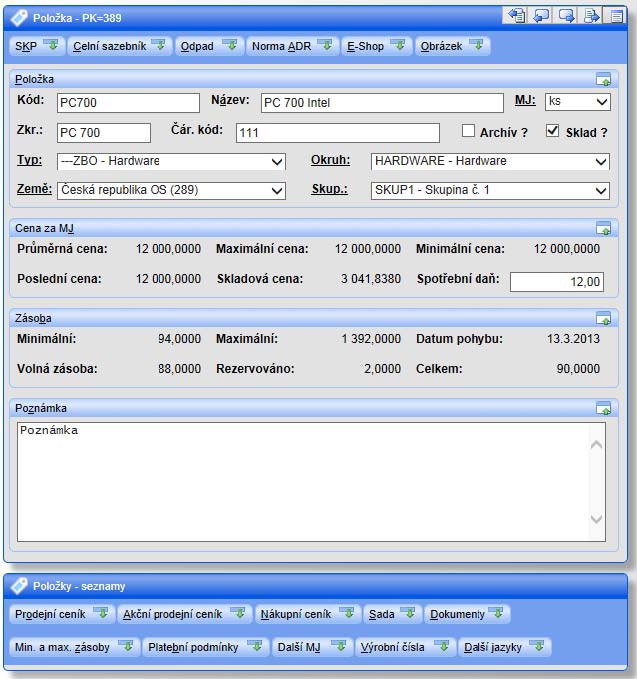 • Ceníky, dokumenty, MJ, zásoby jsou přímo na hlavním formuláři ve spodní části